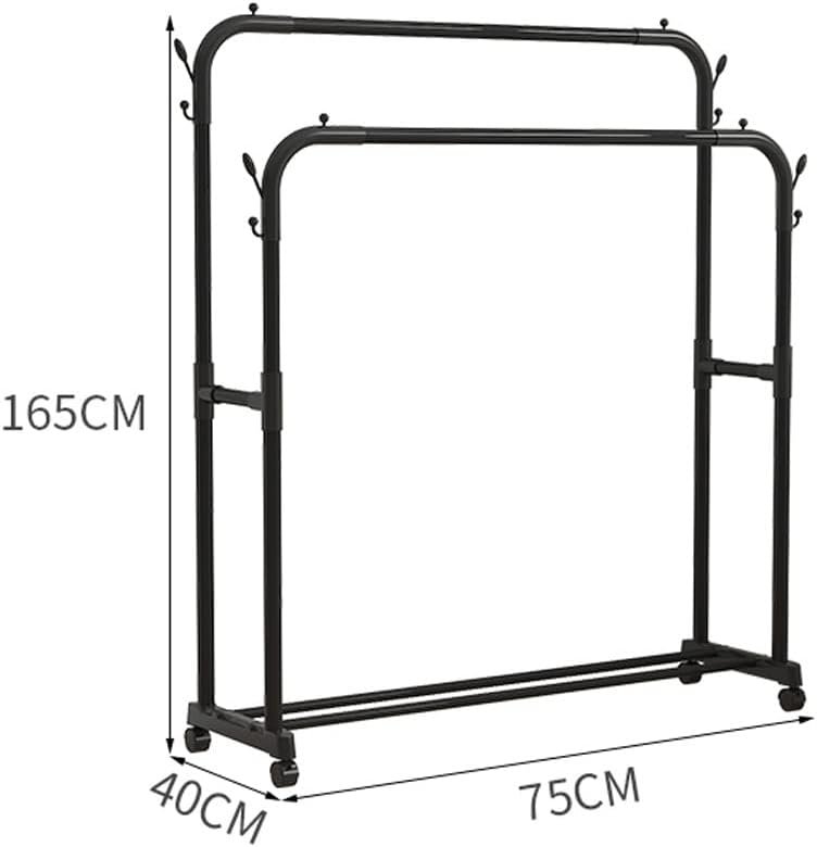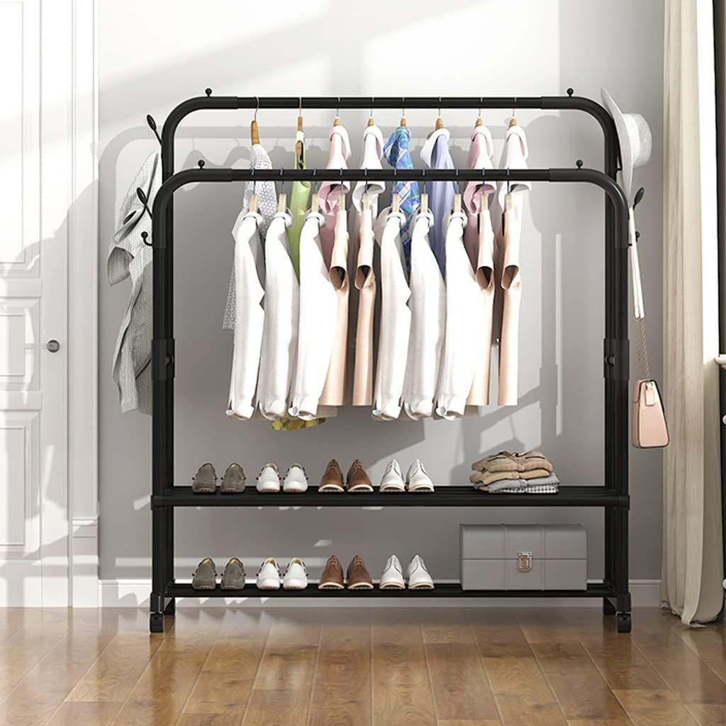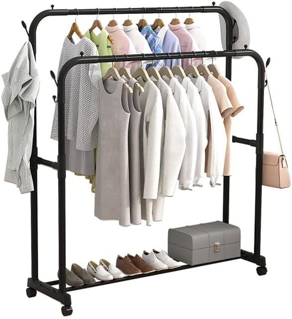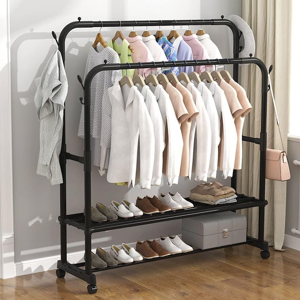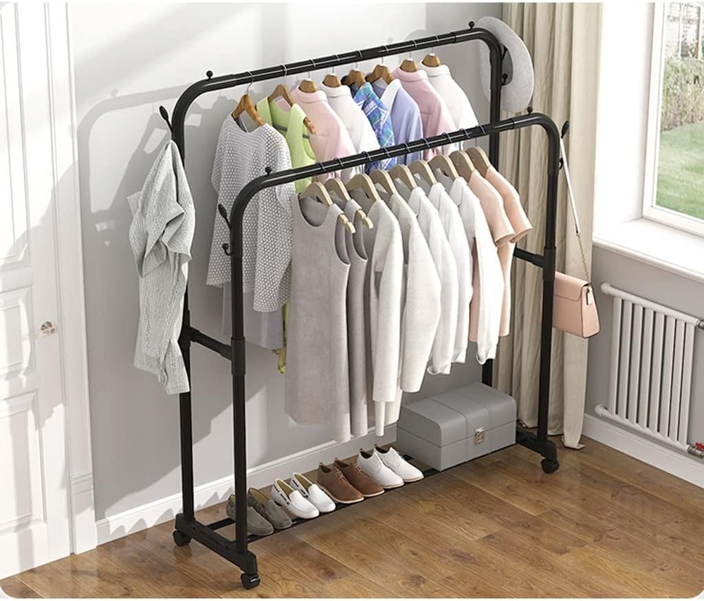 Double clothes rails hold coats, shirts, and pants.