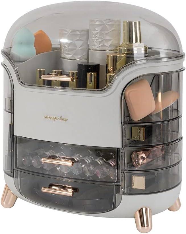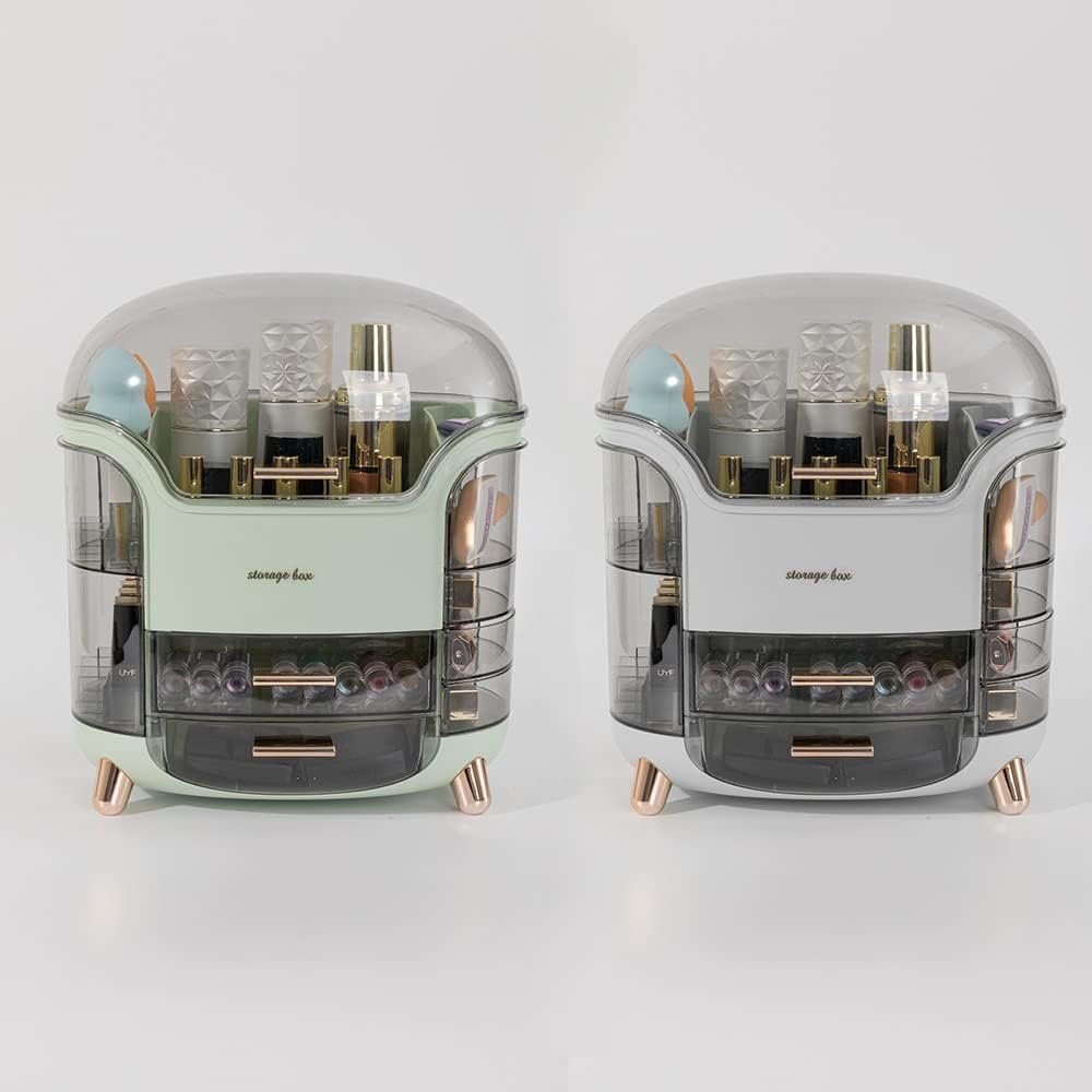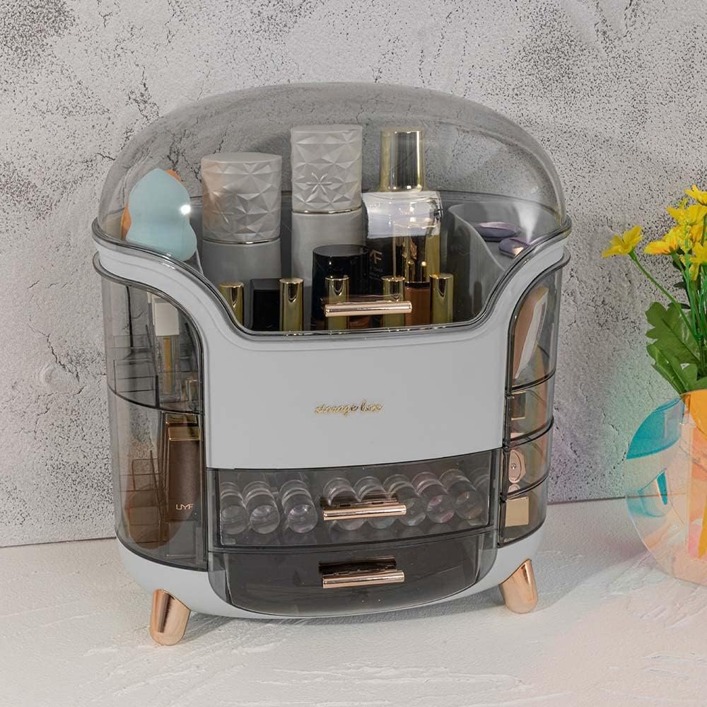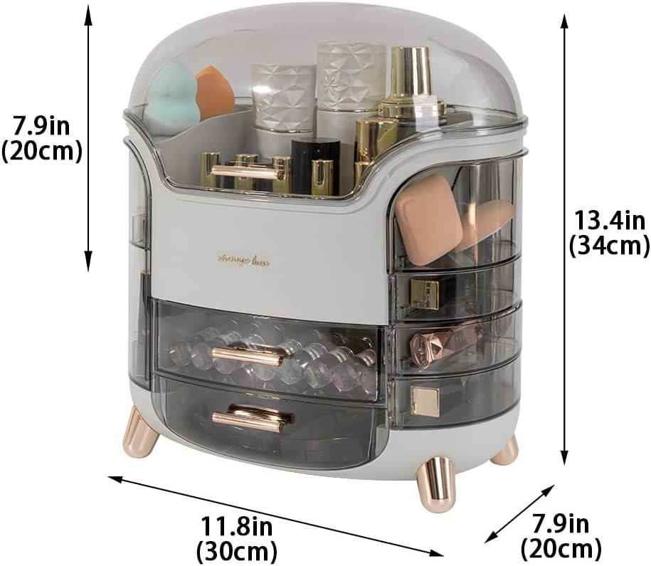 Includes 2 drawers, 2 lipstick holders with 18 slots, 4 rotatable semicircle cases, and a large middle top storage space with a transparent gray dustproof lid.