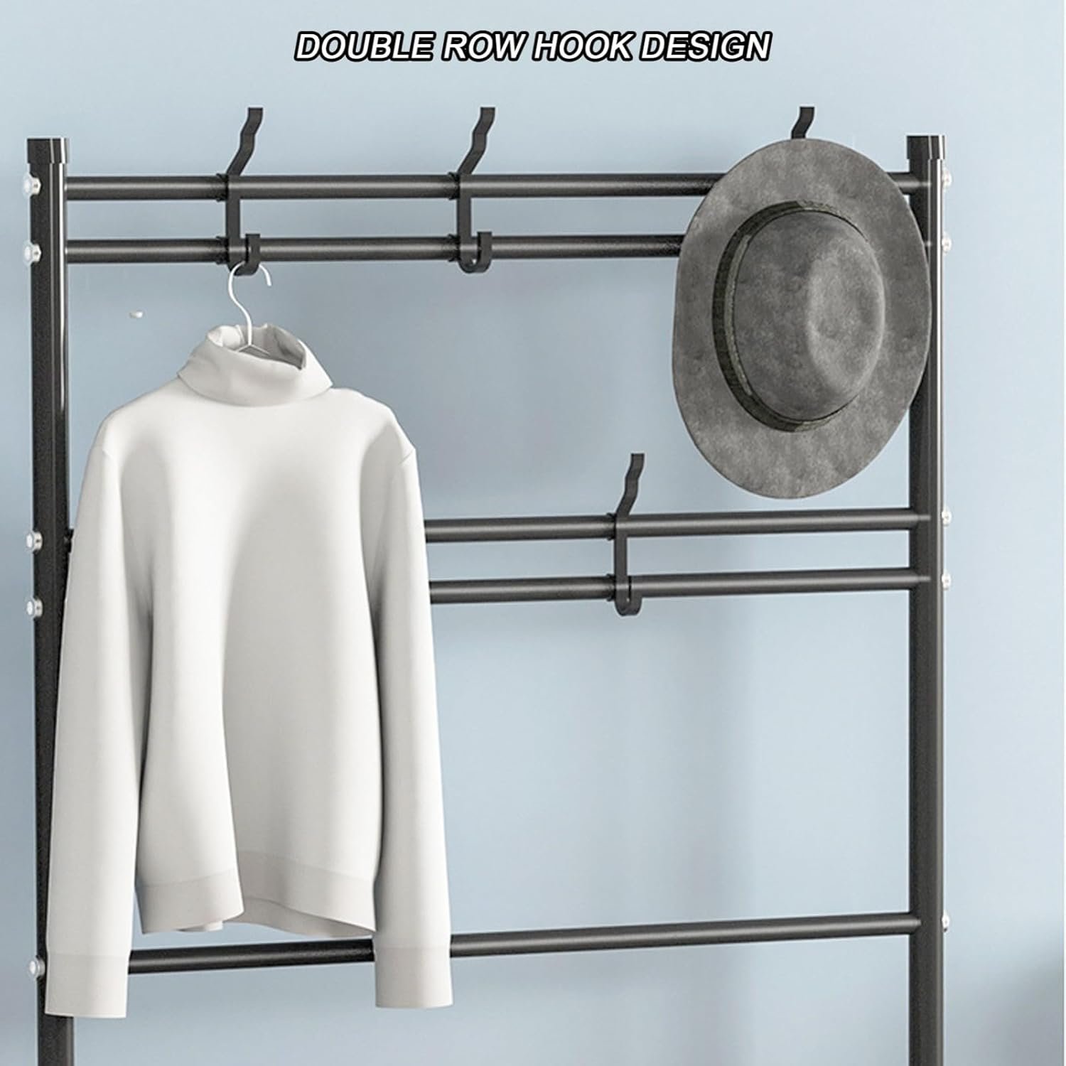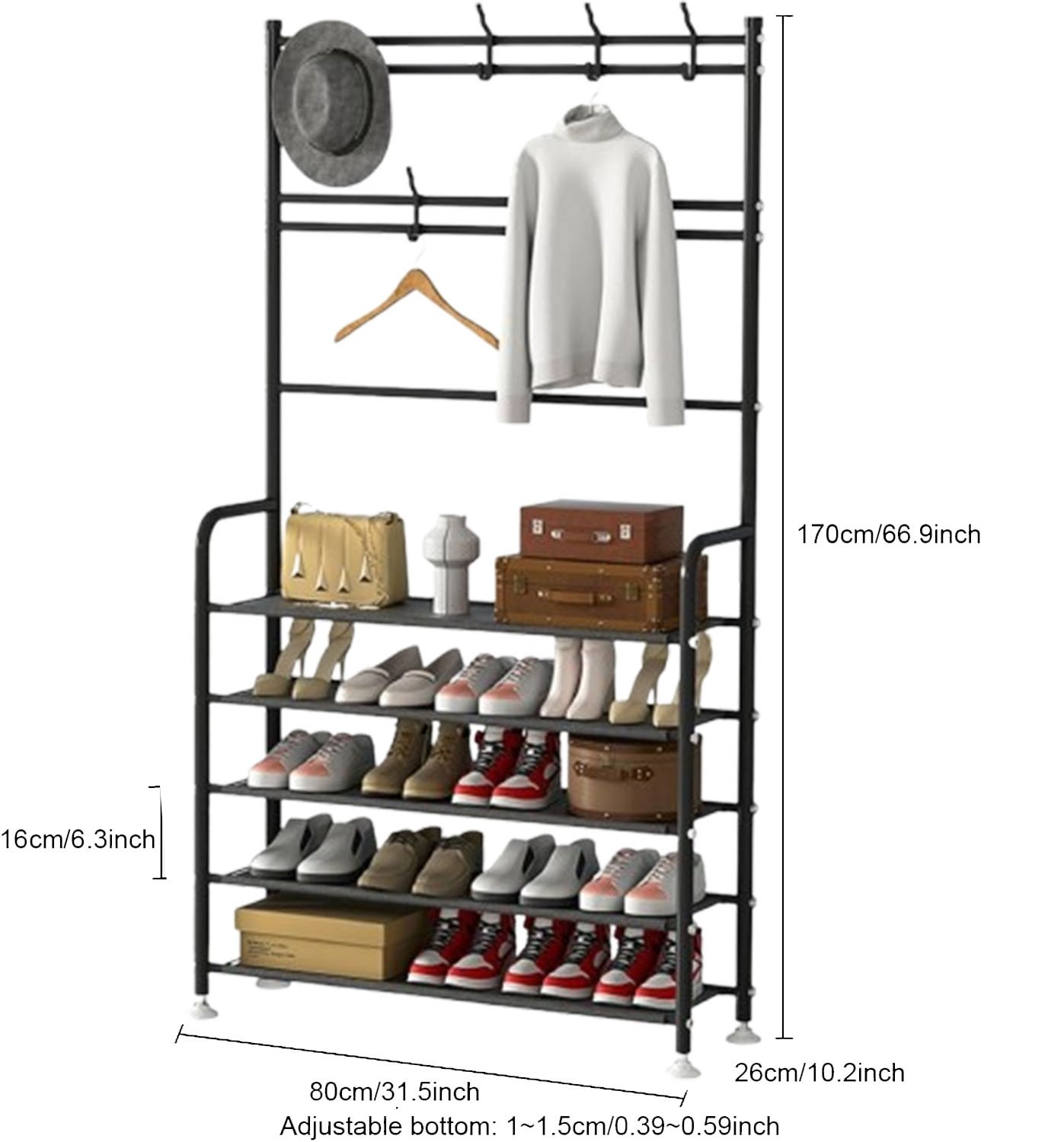 Features strong hooks for coats, hats, scarves, and bags, plus a board shelf for shoes.